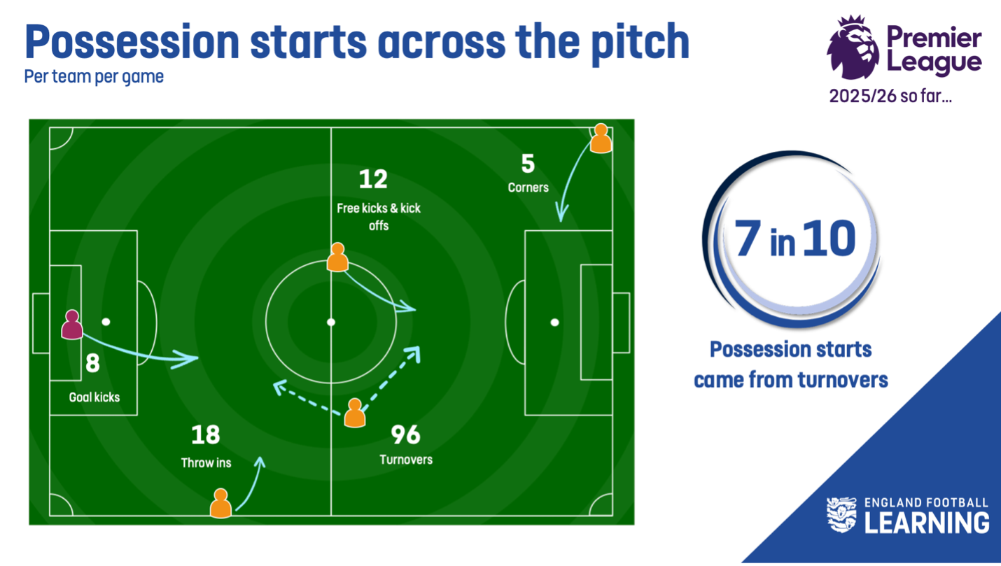 This image shows the frequency of different possession starts per team for each game. The data comes from the 2025/2026 English Premier League season. Correct as of 24th February 2026.