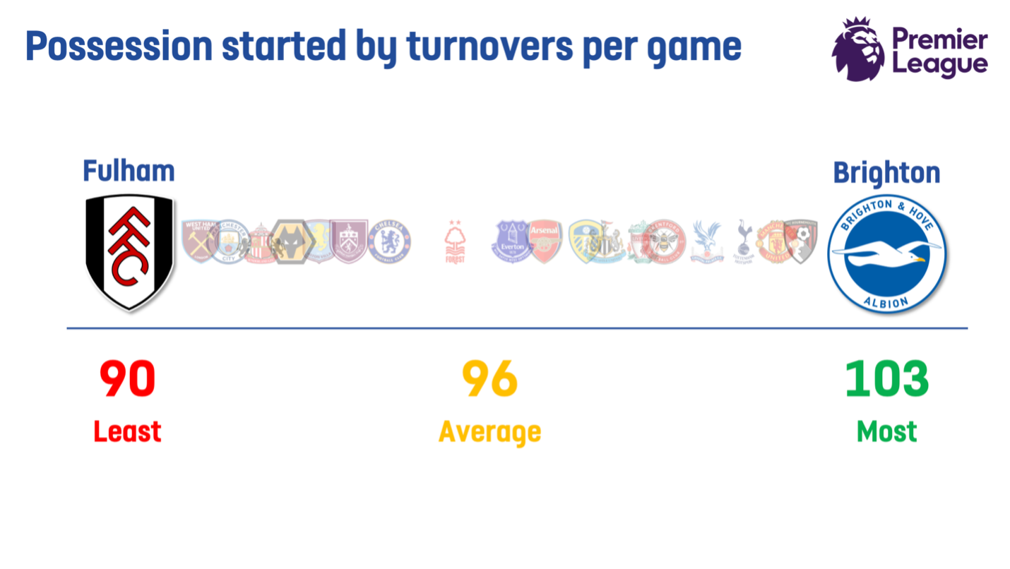 This image shows how many turnovers each team has per game. The data comes from the 2025/2026 English Premier League season. Correct as of 24th February 2026. Fulham have the fewest turnovers per game (90) and Brighton have the most (103). There is not much variation from the average.