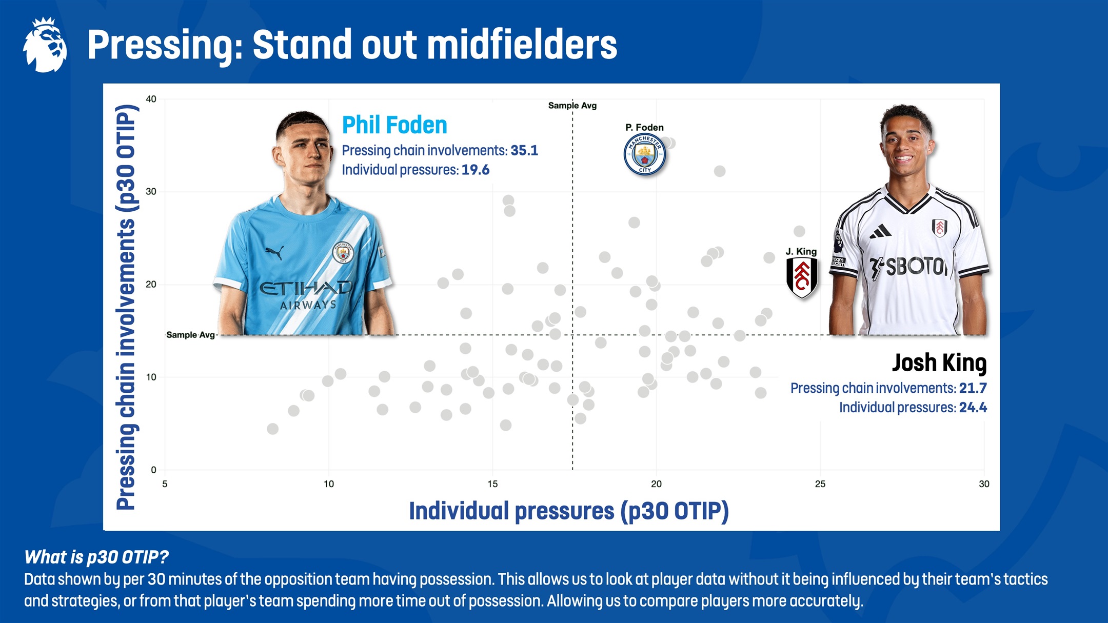 Here are two top midfielders in the Premier League this season who excel at pressing. Josh King and Phil Foden both have to press in a chain and as an individual. While King at Fulham does more individual pressing, Foden presses more in a chain. Consider the technical differences in these types of presses and how they relate to the six capabilities.