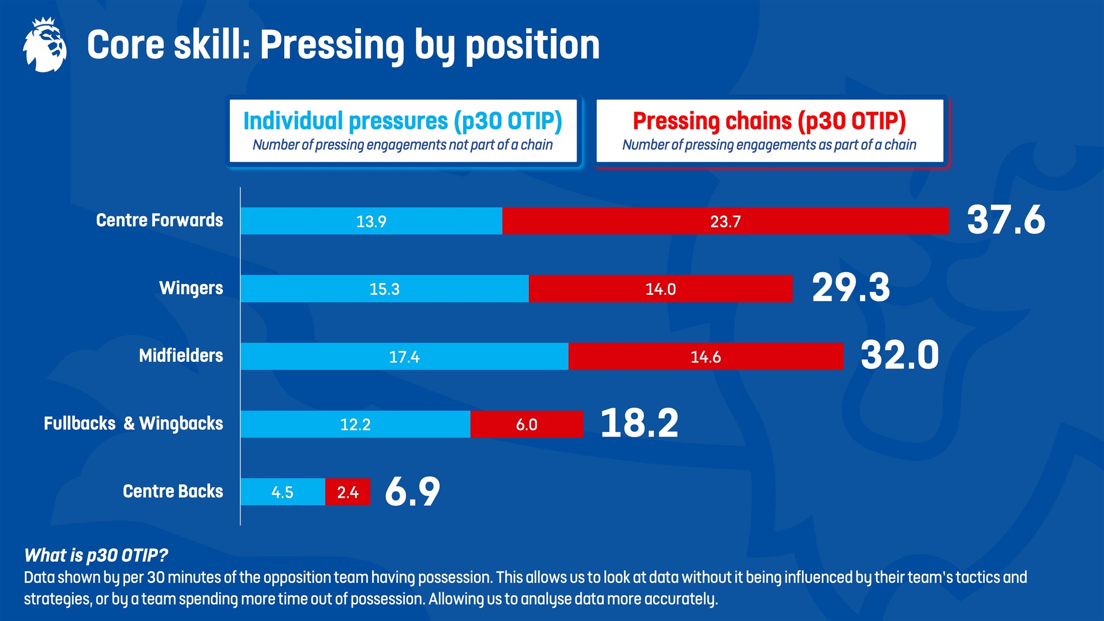 The details of using these six capabilities may differ for other positions. For example, midfielders apply the most individual pressures, and have a high involvement in pressing chains.