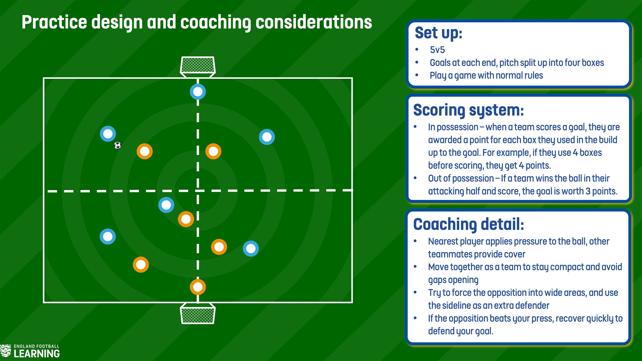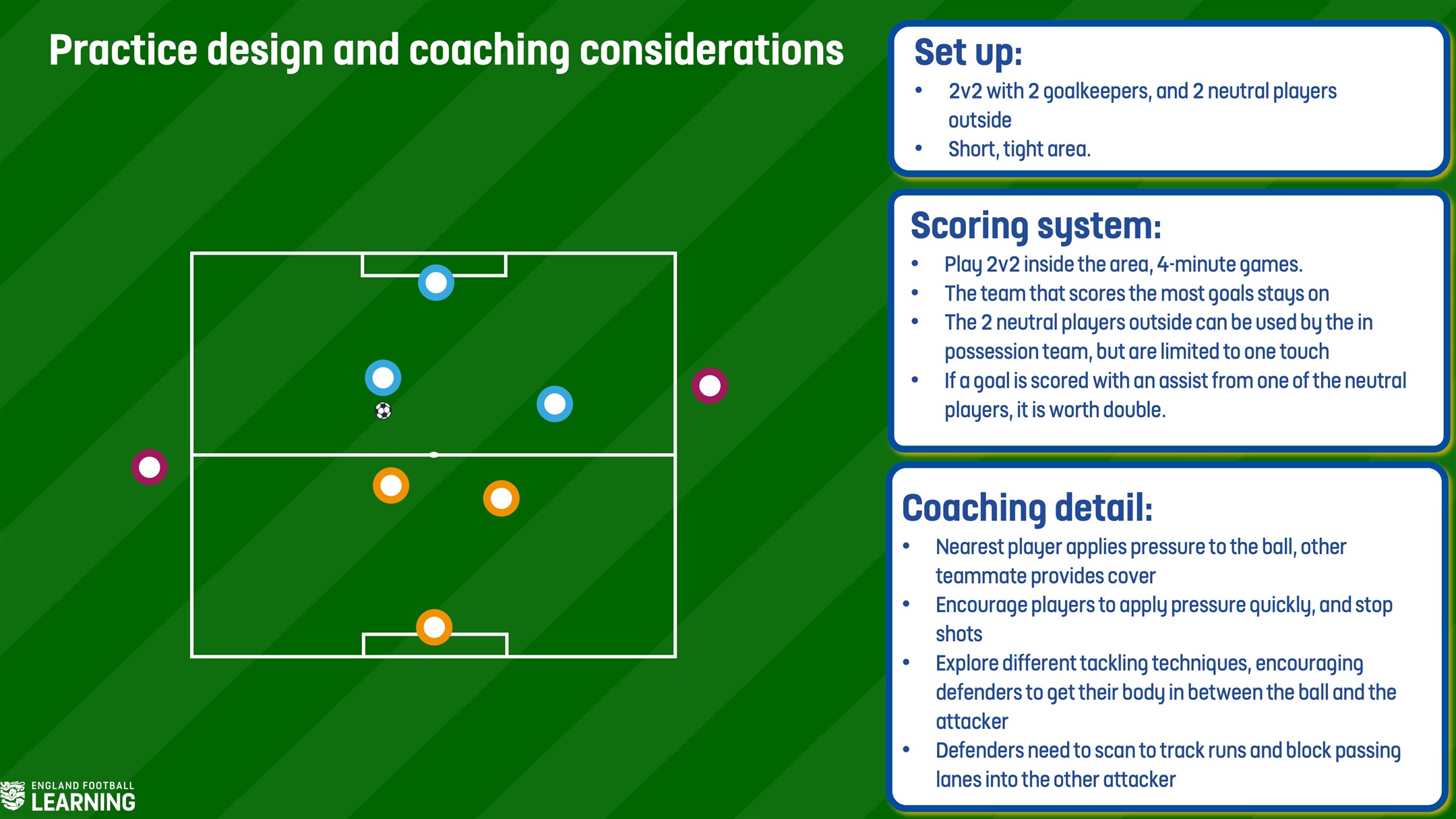 Ensure your training sessions have repetition, realism, and relevance. This will help your players develop their pressing and challenging skills. Encourage your players by coaching: