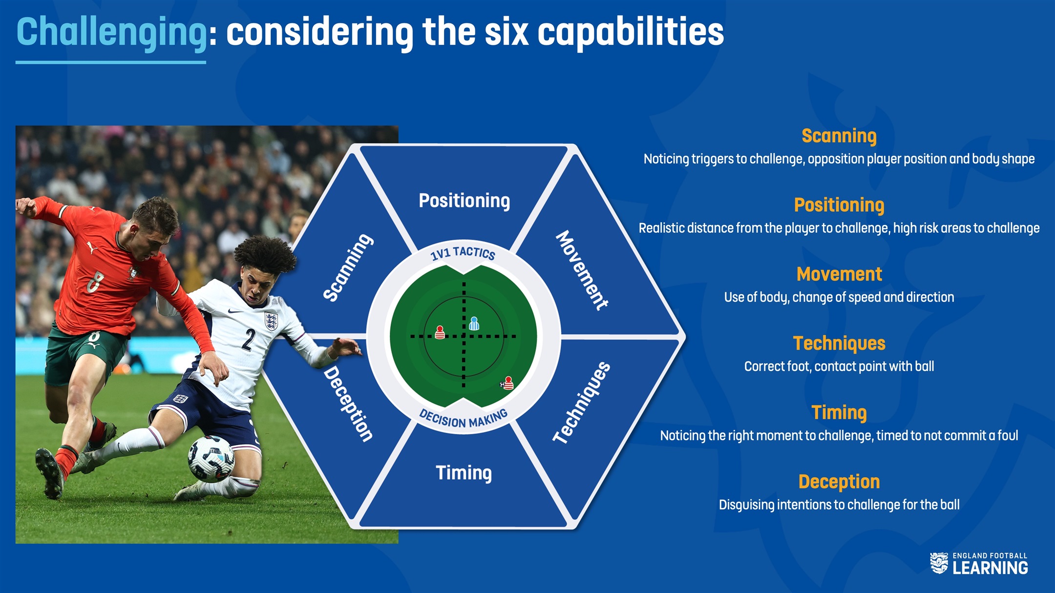 This will link into the teams' tactics and strategies. But, the scenarios look different for the player executing the core skill. Consider the players on your team and the scenarios they encounter to challenge for the ball. The key is to then design game-realistic practices which reflect those scenarios.