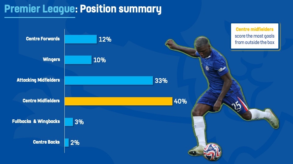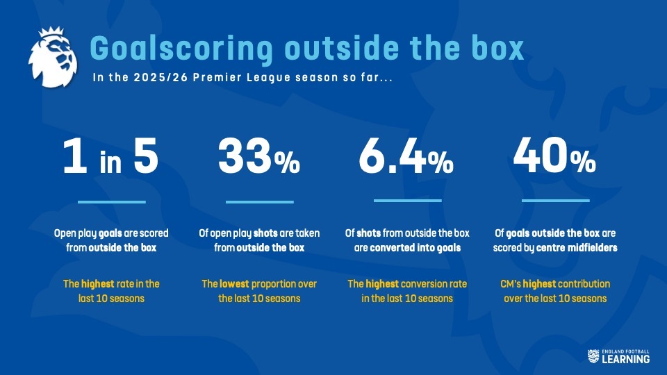 Centre midfielders and attacking midfielders account for almost 75% of goals from outside the box this season. When designing game-realistic practices, ensure central and attacking midfielders have enough repetition of long-range shooting to support technical development.