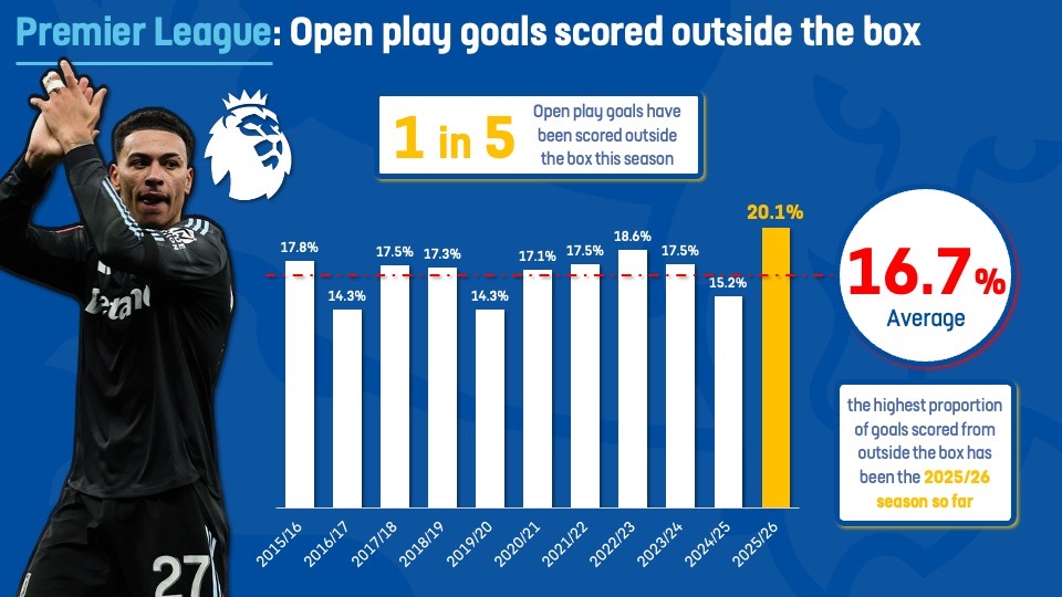 In a league built on speed, precision, and tactical evolution, the art of scoring from distance has become more than just a highlight‑reel moment - it’s a window into how the Premier League is changing. In this blog, Game Insights Analyst James Cook investigates past and current data on goalscoring from outside the box.