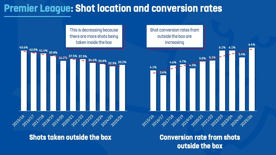 Are elite footballers taking more shots from outside the box? Are players becoming technically better at executing long-range shots? Are players making smarter decisions on when to shoot from outside the box?