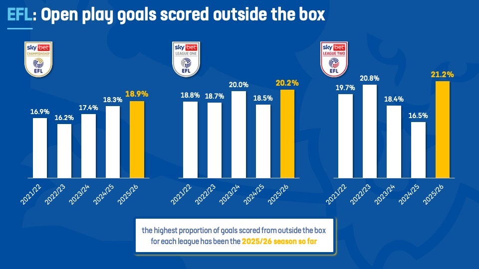 20% of goals this season were scored from outside the box – the highest in a Premier League season, and higher than the average of the previous 10 seasons of 16.7%. Looking back at the past 5 seasons across the EFL, there is a consistent pattern of a spike in goals scored from outside the box this season.